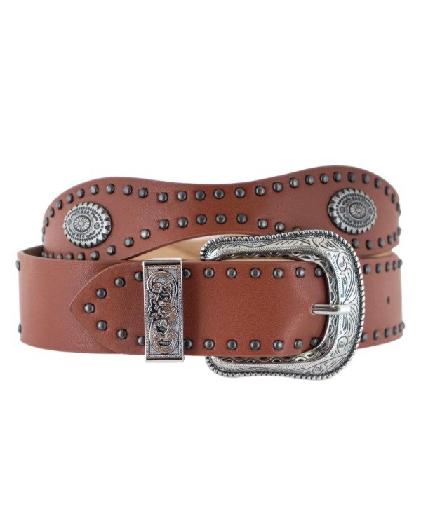 Cinto ondulado importado con chapas, tachas y hebilla grabada.